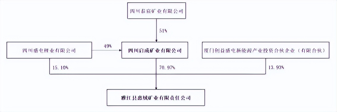 据了解,本次交易完成前,盛屯锂业和四川泰宸矿业有限公司分别持有启成矿业49%和51%股权。启成矿业及其控股子公司惠绒矿业的股权结构如下: