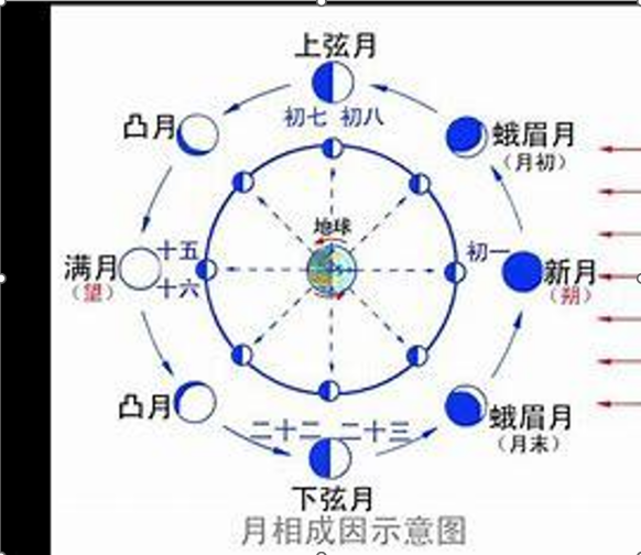 当地球位于月球和太阳之间时,我们可以看到整个被太阳直射的月球部分,这就是满月。当月球位于地球和太阳之间时,我们只能看到月球不被太阳照射的部分,这就是朔月;而当首度再见到月球明亮的部分时,称为“新月”。当地月联线和日地联线正好成直角时,我们正好可以看到月球被太阳直射的部分的一半,这就是上弦月。