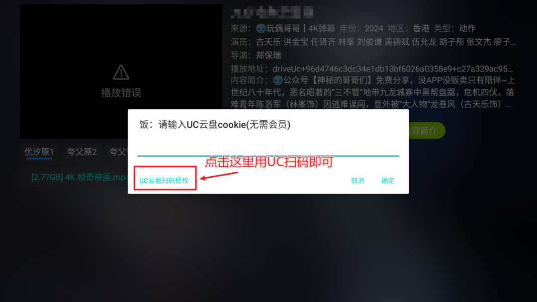 https://ghproxy.net/https://raw.githubusercontent.com/yyfxz/qqtv/main/qq.on鉴于大家非常关注清晰度,特别提示:有些接口,比如饭太硬,你搜索的资源结果里,会有一些4k资源(如:玩偶哥哥 | 4K弹幕),你点进这些资源里,会弹出UC云盘扫码提示。使用UC浏览器,登录账户后扫码授权即可观看(如提示阿里云盘或其他云盘,则请使用对应app登录扫码即可)。