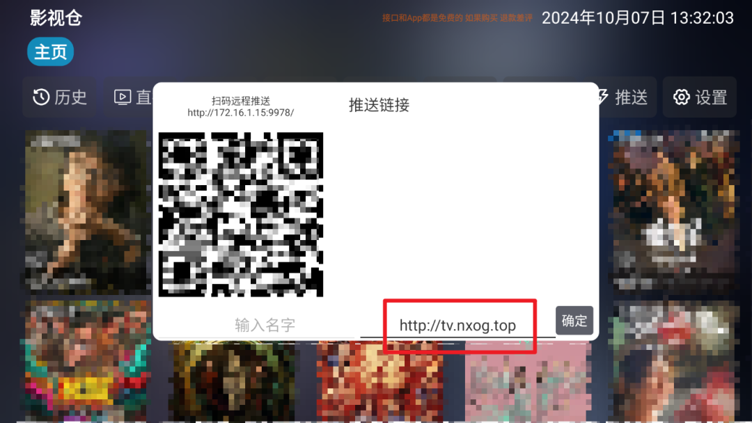 如果觉得逐个字母输入麻烦,可使用与电视处于相同网络的手机微信扫码,在手机端将接口地址推送到电视上再点“确定”即可。下边将所有接口直接奉上。