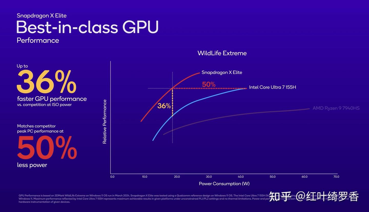 以Wild Life Extreme的测试来看,X Elite能够在20W功耗下跑出Ultra 7 155H在40W功耗下的峰值性能,功耗低了50%。而在20W功耗下,X Elite可以强36%左右。