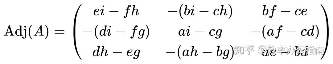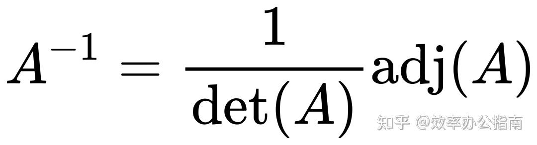 其中 det(A) 是矩阵 A 的行列式, adj(A) 是 A 的伴随矩阵,伴随矩阵由 A 的各个元素的代数余子式组成。