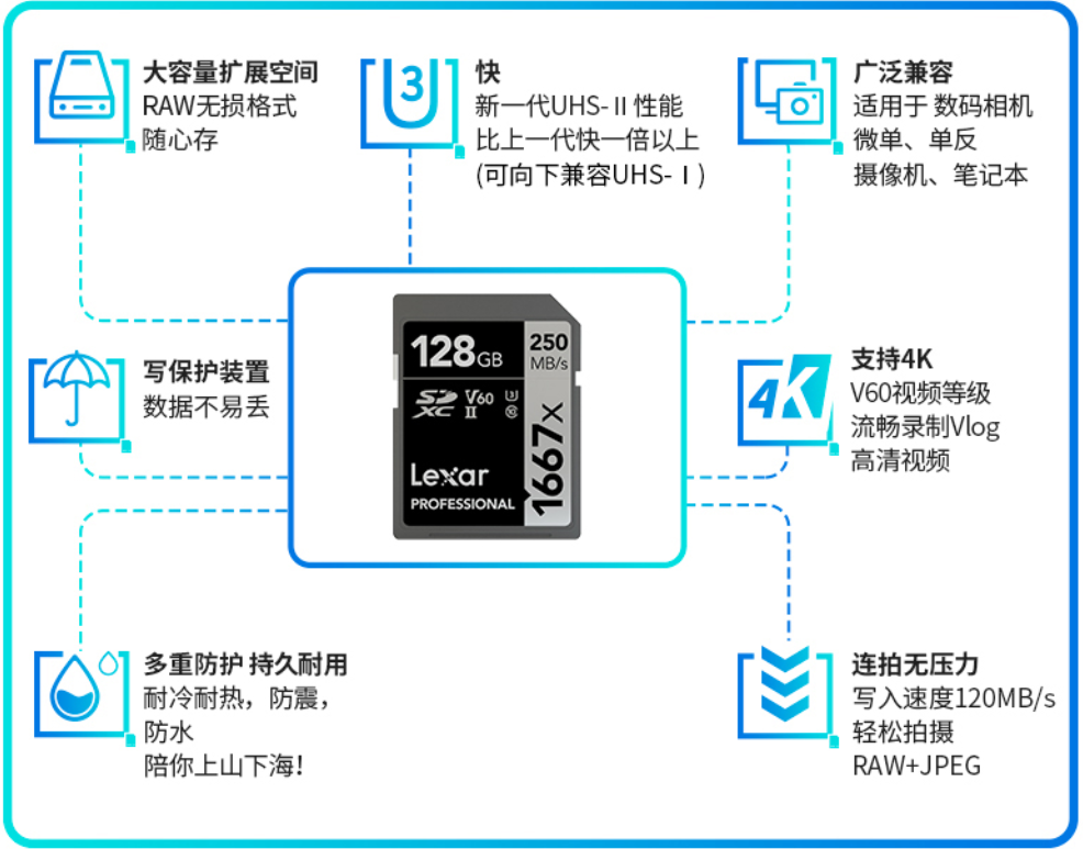 ▲当然,如果录制视频频率比较高,需要经常向电脑上拷贝视频文件的话,那么读取速度就显得更重要了,雷克沙UHS-Ⅱ标准的1667X Pro拥有着250MB/s的读取速度以及120MB/s的写入速度,可以节约大量的复制文件时间。
