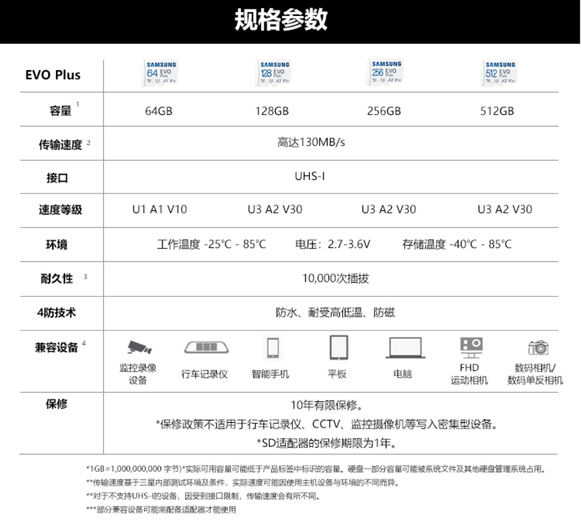 ▲入门级TF卡这里推一款三星的白卡,其读取可达到为130MB/s,不过并未标注写入速度,所以个人还是建议放在Switch等重点考虑读取速度设备上使用,而云台、监控等对写入速度要求高的设备,个人还是不建议用这款TF卡的。