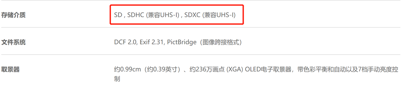 刚才说到了移动设备支持的到底是UHS-Ⅰ标准还是UHS-Ⅱ标准,确认这点最好的办法就是官方网站或者官方客服电话了,以SD卡最常用的设备照相机为例: