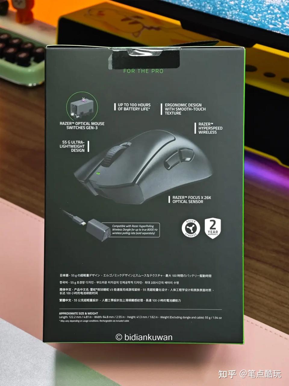 包装背面一览:包括55克轻量化、人体工学+类肤表面设计、26000DPI、第三代雷蛇光学微动、百小时续航、HyperSpeed Wireless无线技术、搭配HyperPolling接收器可达到原生8000Hz无线轮询率等。此外,它还支持HyperSpeed多设备配对技术,HyperShift第二套按键绑定功能,鼠标按键点击寿命约9000万次,触发时间仅需0.2秒,回弹无延迟。