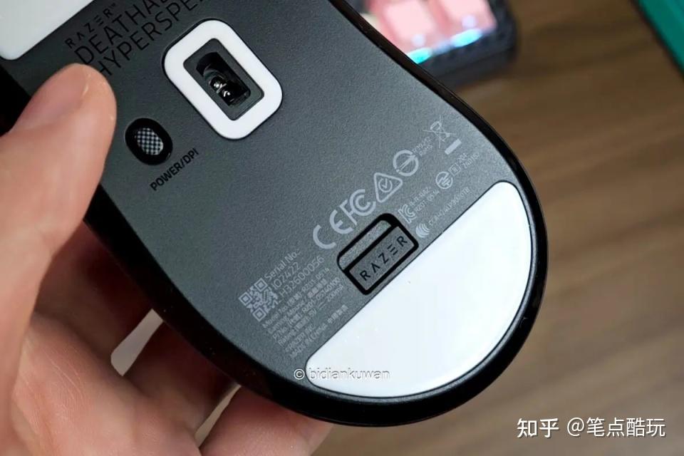 鼠标底部布局特写。电源和DPI切换合为一键,三区大面积PTFE脚垫布局,还设计了一个USB接收器仓,收纳便携度拉满。