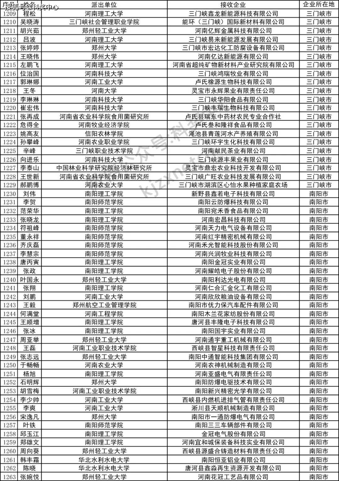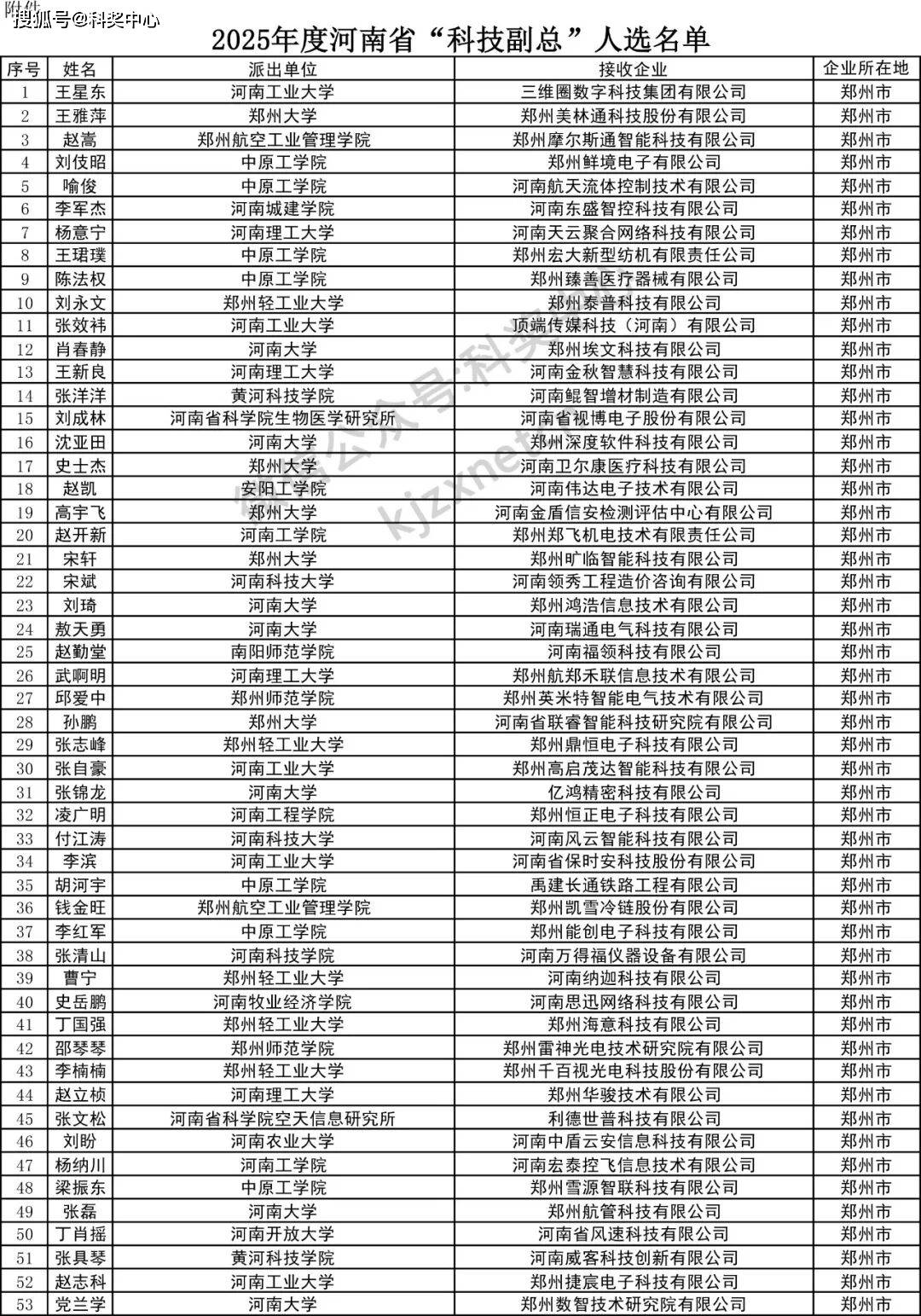 为深入贯彻落实创新驱动发展战略,统筹推进教育科技人才一体化发展,根据《河南省“科技副总”三年行动计划(2024-2026年)》(豫科〔2024〕75号)有关安排部署,经需求征集、岗位发布、企业申报、地市推荐、专家审核、名单公示等程序,省科技厅会同省委组织部遴选确定了2025年度1518名河南省“科技副总”名单(详见附件),现予公布。