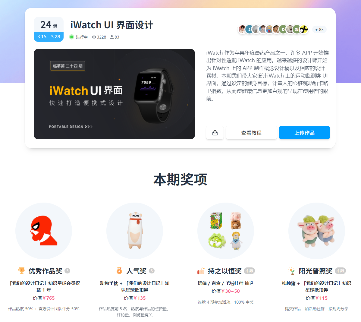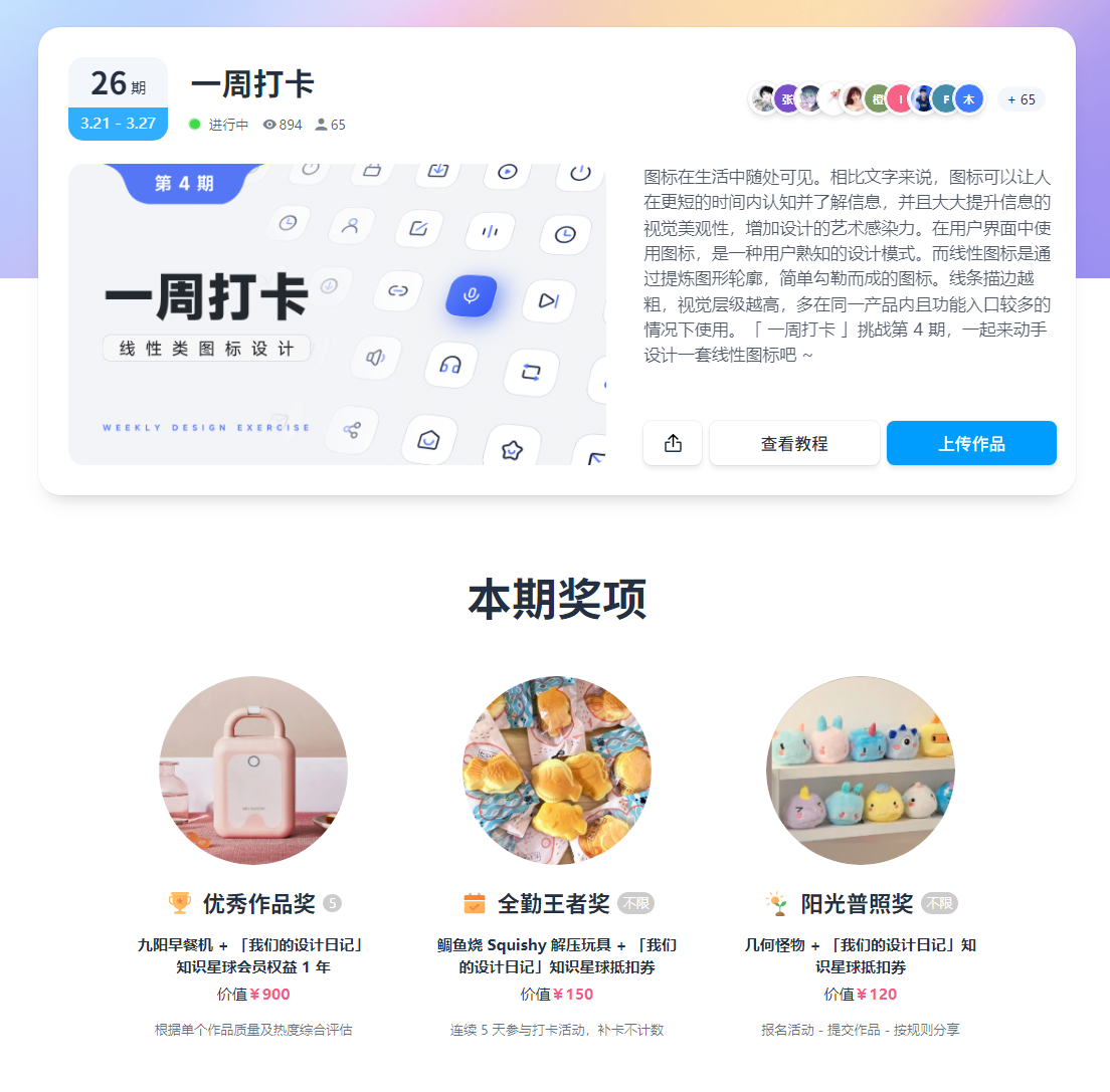 一周打卡自上线以来,好评不断。难度升级,奖品加码,能够获得更为系统的设计锻炼。