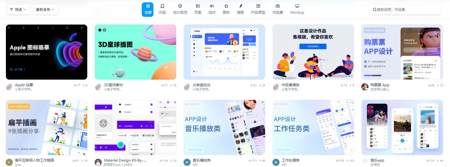 资源广场:资源数已近2000+,涵盖作品、设计规范、页面、组件、图标、作品原型、作品集、样机多种类型。