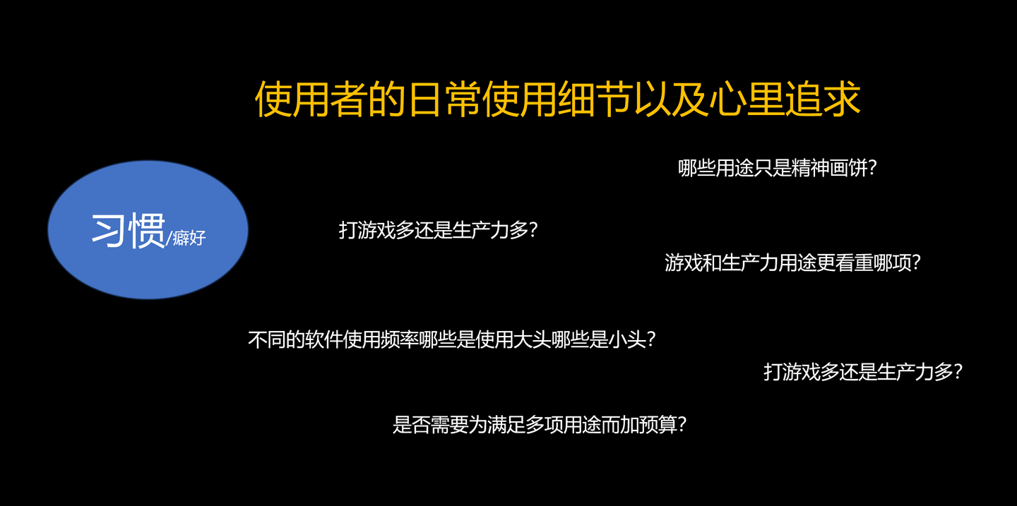 而所谓习惯,那就需要针对使用者的日常使用的方方面面来对配置单再做更细的切分,比如说在有限的预算下该如何权衡多个主要用途,这就需要根据使用者的使用习惯来做切分