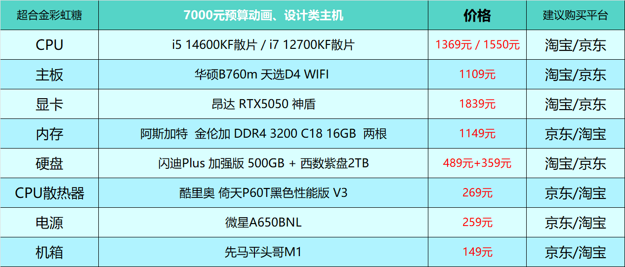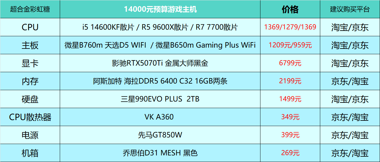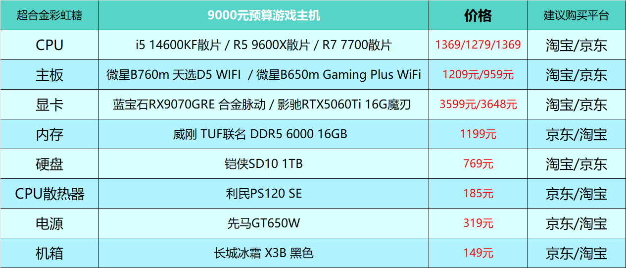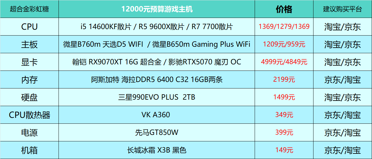 在保留CPU和主板搭配的思路下,将显卡再升一级,然后双内存补齐,在留有一些预算的情况下将固态升级了一下,大家也可以自己稍作修改,如果显卡选择5070的话其实电源650W/750W也可以用,850W是为9070XT准备的