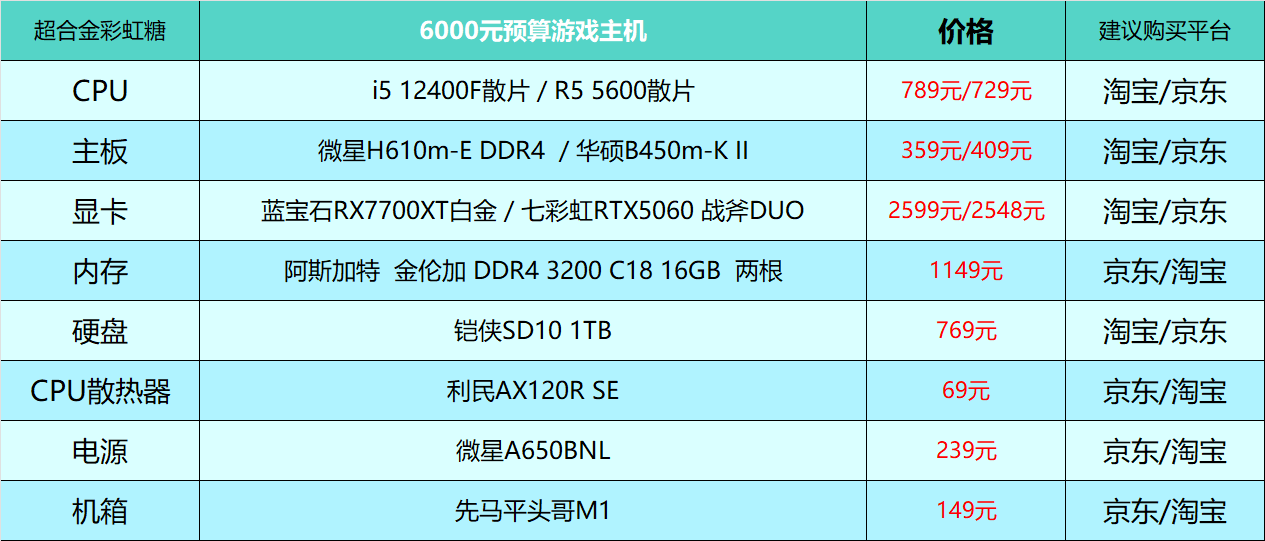 要想有显著改变,所以预算增加到了6K,实现了12400F/5600+7700XT/5060方案