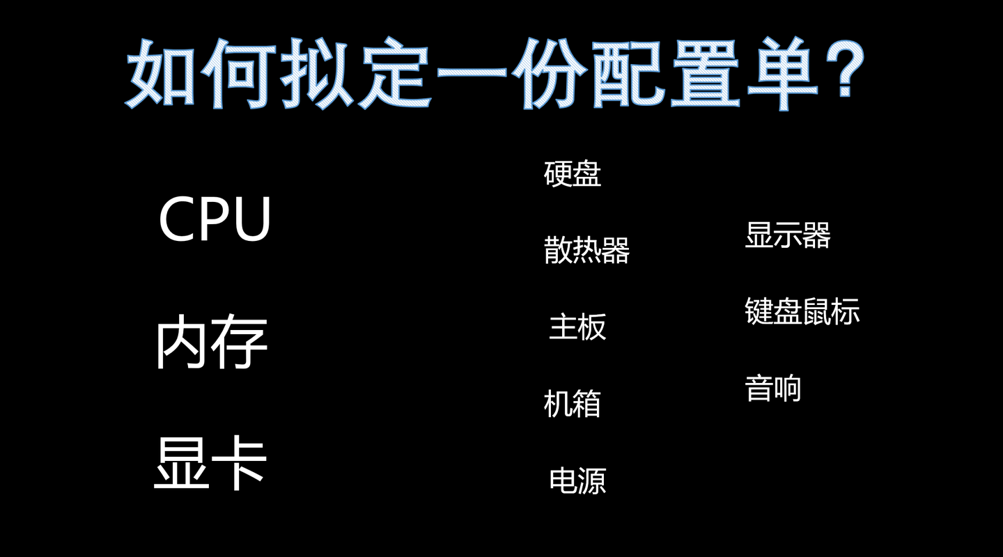 一套基本的配置单会分CPU 、主板、显卡、内存、硬盘、散热器以及电源和机箱