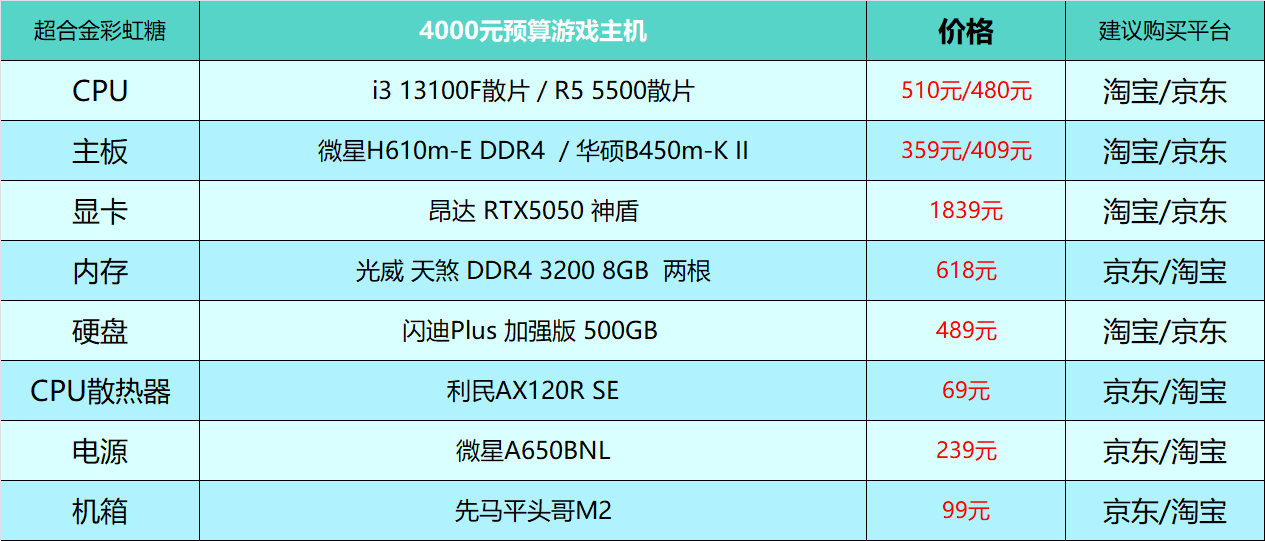 在之前这里是4K预算,这一套主要是把显卡升级到了5050,性能对比6500XT大幅增强,CPU也可以选择5500方案,搭配B450主板