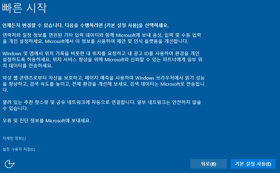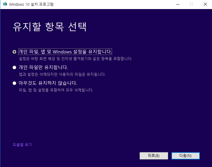 Windows 설정, 개인 파일 및 앱을 유지한 채로 설치하는 것이 기본 설정이며, 만약 개인 파일만 유지한 채로 설치하거나 아무것도 유지하지 않은 채로 설치하려면 '유지할 항목 변경'을 클릭하여 선택 후 다음 버튼을 클릭합니다.