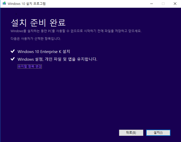 4. 설치 준비 완료 창이 나타나고, 설치되는 Windows 버전과 유지 및 설치되는 형태에 대해 표시가 되면 이를 확인한 후 설치 버튼을 클릭합니다.