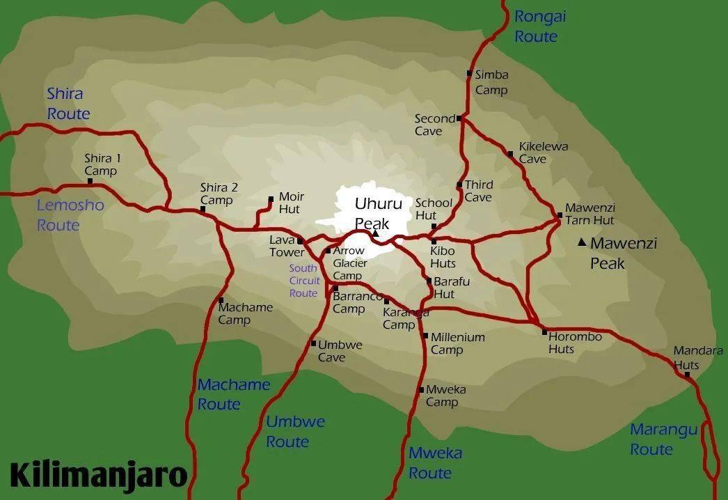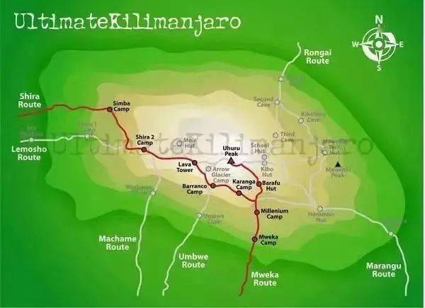 乞力马扎罗攀登线路众多,目前选择较多的有10天莱莫绍线(Lemosho),9天马切姆线(Macheme),8天龙盖线(Rongai),7天马兰古线(Marangu),其中,莱莫绍线(Lemosho)是乞力马扎罗国家公园官方认证登顶率最高的线路。